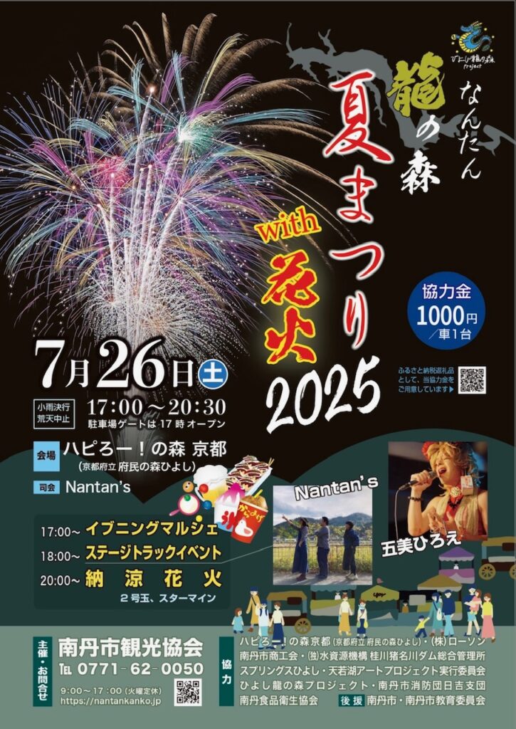 日吉町観光協会恒例の花火大会は、本年より南丹市観光協会主催となり。「なんたん龍の森夏まつり2025with花火」として開催する運びとなりました。