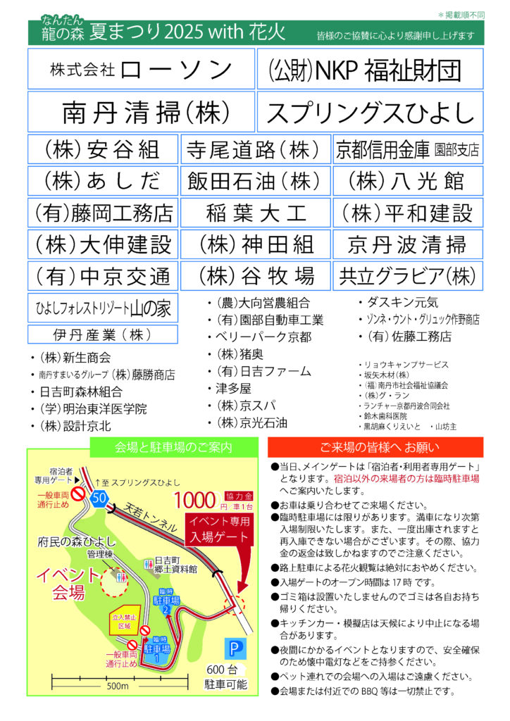 協力:ハピろー!の森 京都・株式会社ローソン・南丹市商工会・(独)水資源機構桂川猪名川ダム総合管理所・スプリングスひよし・天若湖アートプロジェクト実行委員会・ひよし龍の森プロジェクト・南丹市消防団日吉支団・南丹食品衛生協会